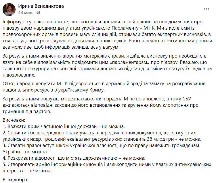 В конце своего поста Венедиктова сделала пять выводов, которые дают представление о характере инкриминируемых преступлений: