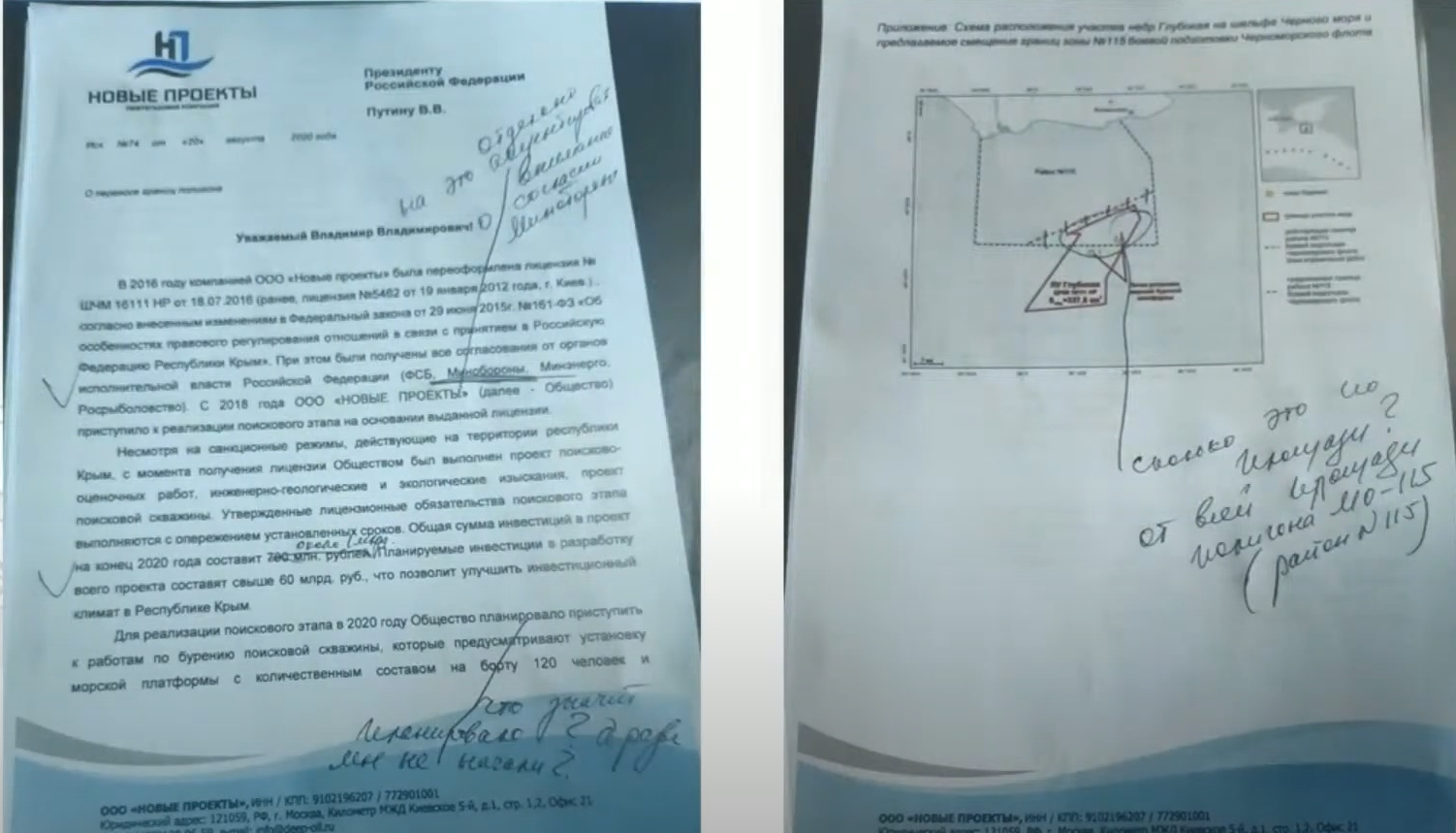 Второе доказательство - письмо от уже российских "Новых проектов" в адрес Путина, где звучит обоснование, почему именно этой компании нужно передать участок шельфа.