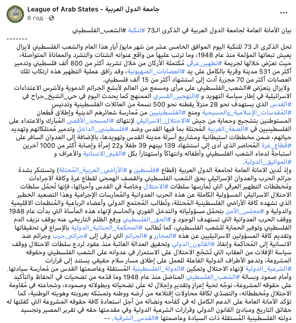 В организации осудили действия Израиля в секторе Газа, назвав "варварскими" удары по населенным пунктам палестинского анклава, которые привели к многочисленным жертвам. В ЛАГ потребовали от международного сообщества, стран - членов ближневосточного "квартета", региональных и международных организаций, а также от Совбеза ООН незамедлительно вмешаться в конфликт, чтобы "положить конец трагедии, начавшейся в 1948 году, и остановить агрессивную войну против палестинцев".