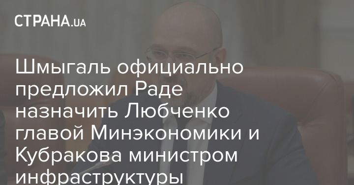 "Премьер-министр Денис Шмыгаль по предложению фракции "Слуга народа", которая имеет права коалиции, подал в Верховную Раду кандидатуры: Алексея Любченко - на должность первого вице-премьер-министра - министра экономики, Александра Кубракова - на должность министра инфраструктуры, Виктора Ляшко - на должность министра здравоохранения", - сказала в комментарии агентству "Интерфакс-Украина" пресс-секретарь премьера Ольга Куришко.