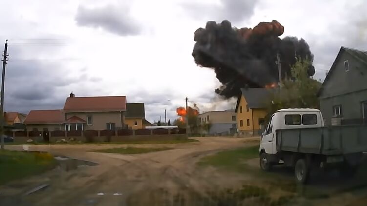 Момент крушения военного самолета в белорусском городе Барановичи, который разбился накануне, попал на видео.