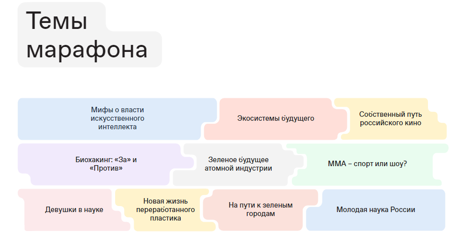 Каждый из городов представит одно из направлений просветительской деятельности: история и культура, наука и технологии, индустрия и промышленность, спорт, информационные технологии, экология. Кроме того, в рамках марафона должны пройти более 100 дискуссий, лекций, мастер-классов, интервью, открытых уроков.