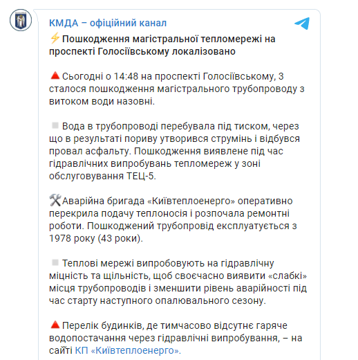 "Сегодня в 14:48 на проспекте Голосеевском, 3 произошло повреждение магистрального трубопровода с утечкой воды наружу. Вода в трубопроводе находилась под давлением, из-за чего в результате порыва образовалась струя и произошел провал асфальта. Повреждение обнаружено во время гидравлических испытаний теплосетей в зоне обслуживания ТЭЦ-5 ", - говорится в сообщении КГГА.