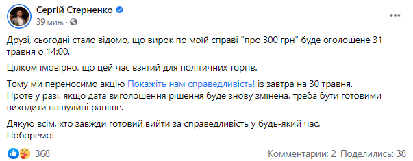 "Друзья, сегодня стало известно, что приговор по моему делу "о 300 грн" будет объявлен 31 мая в 14:00.