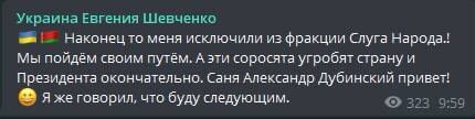 "Наконец то меня исключили из фракции Слуга Народа! Мы пойдём своим путём. А эти соросята угробят страну и президента окончательно. Александр Дубинский привет! Я же говорил, что буду следующим", - прокомментировал Шевченко свое исключение в Telegram.