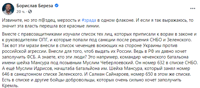 О том, что под санкции попали добробатовцы, написал в Фейсбуке бывший пресс-секретарь "Правого сектора" Борислав Береза.