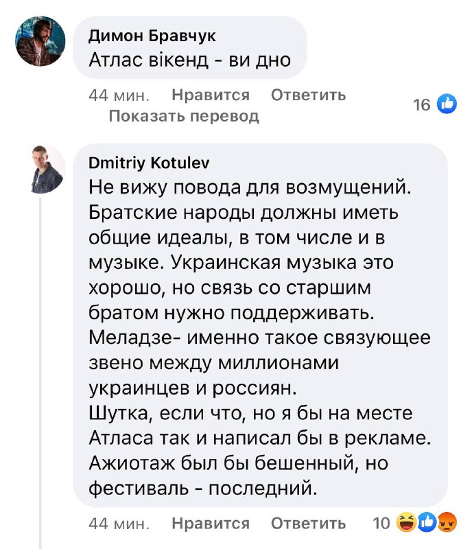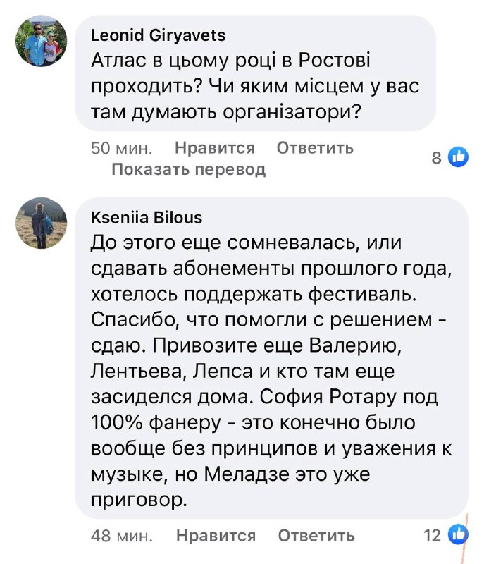 В противовес такой позиции выступили пользователи, которые демонстрировали неприязнь к приглашенному артисту вплоть до возврата билетов. "Atlas Weekend, вы пробили дно! Серьезно??! Я считаю, теперь все сознательные исполнители с правильной украинской позицией должны послать вас к чертям и общество устроит им признание и сольные концерты, а вам бан и ад. Какого черта вы тут зарабатываете? Валите с таким отношением в Московию, без обратного билета и там устраивайте свои оды продажным гнидам", "Серьезно?! Валерчик Меладзе, которому нормально в Раше все эти годы, пока Путин ведет войну на территории нашей страны и убивает наших парней? Ну-ну... Вперед, чуваки!" - пишут пользователи.