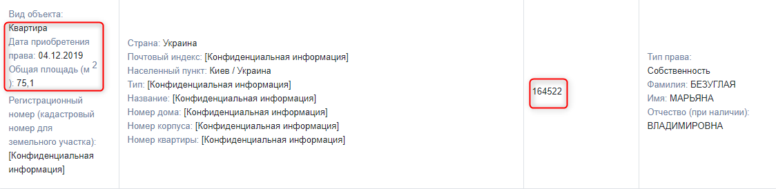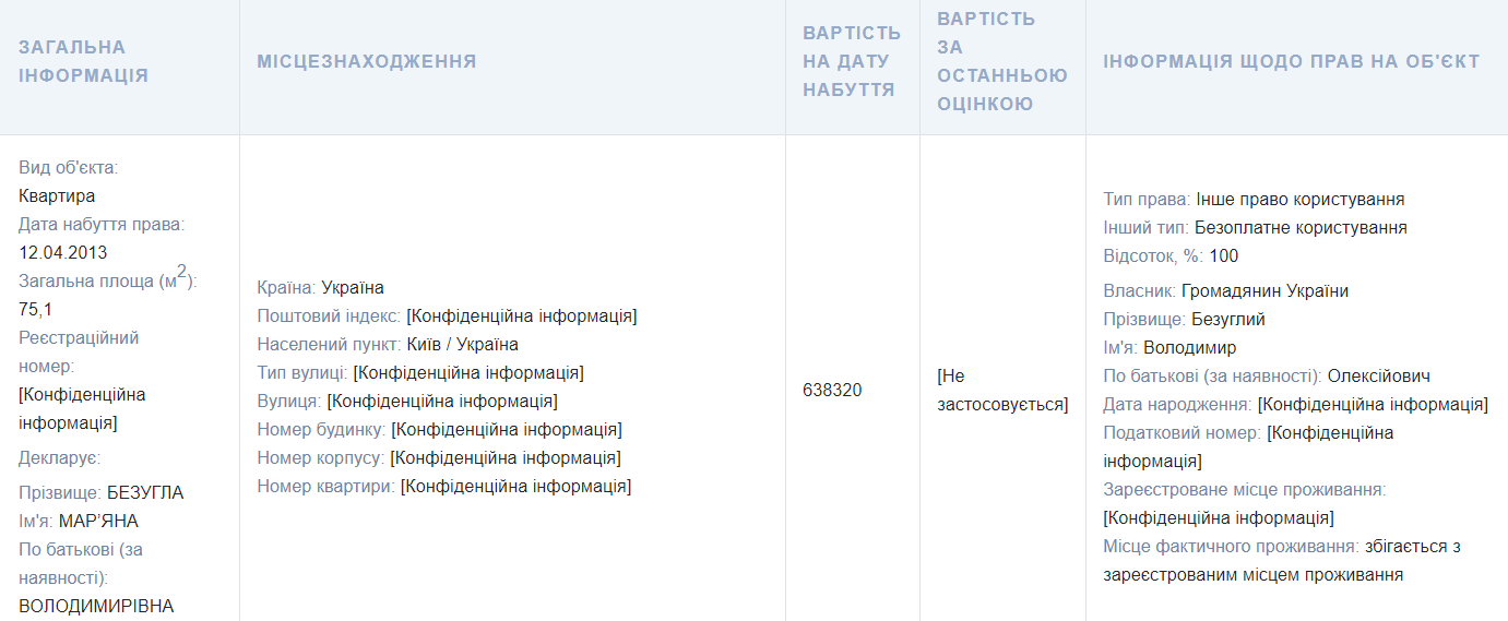 Тогда жилье значилось как собственность отца Марьяны Безуглой - Владимира Алексеевича. А с 2019 года жилье уже числится в собственности самой депутатши (на тот момент она уже была избрана в Раду) и оценивается в четыре раза дешевле.