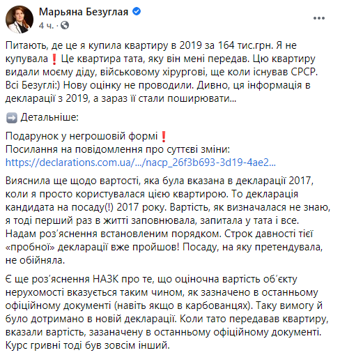 После того как в Сети появились вопросы к жилью Безуглой, депутат прокомментировала дешевую квартиру у себя в Фейсбуке. Она написала, что квартира ей досталась от отца и деда - в наследство.