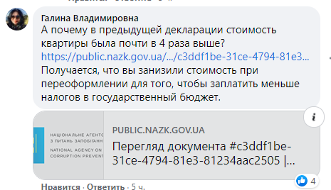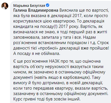 "Выяснила еще по стоимости, которая была указана в декларации 2017, когда просто пользовалась этой квартирой. То была декларация кандидата на должность 2017 года. Стоимость как определялась не знаю, я тогда первый раз в жизни заполняла, спросила у папы, и все. Предоставлю разъяснения в установленном порядке. Срок давности той "пробной" декларации уже прошел! А должность я не занимала. Есть еще разъяснения НАПК о том, что оценочная стоимость объекта недвижимости указывается таким образом, как указано в последнем официальном документе (даже если в рублях). Такое требование и было соблюдено, в новой декларации, когда папа передавал квартиру, указали стоимость, указанную в последнем официальном документе. Курс гривны тогда был совсем другой", - написала она в ответ корреспонденту "Страны".