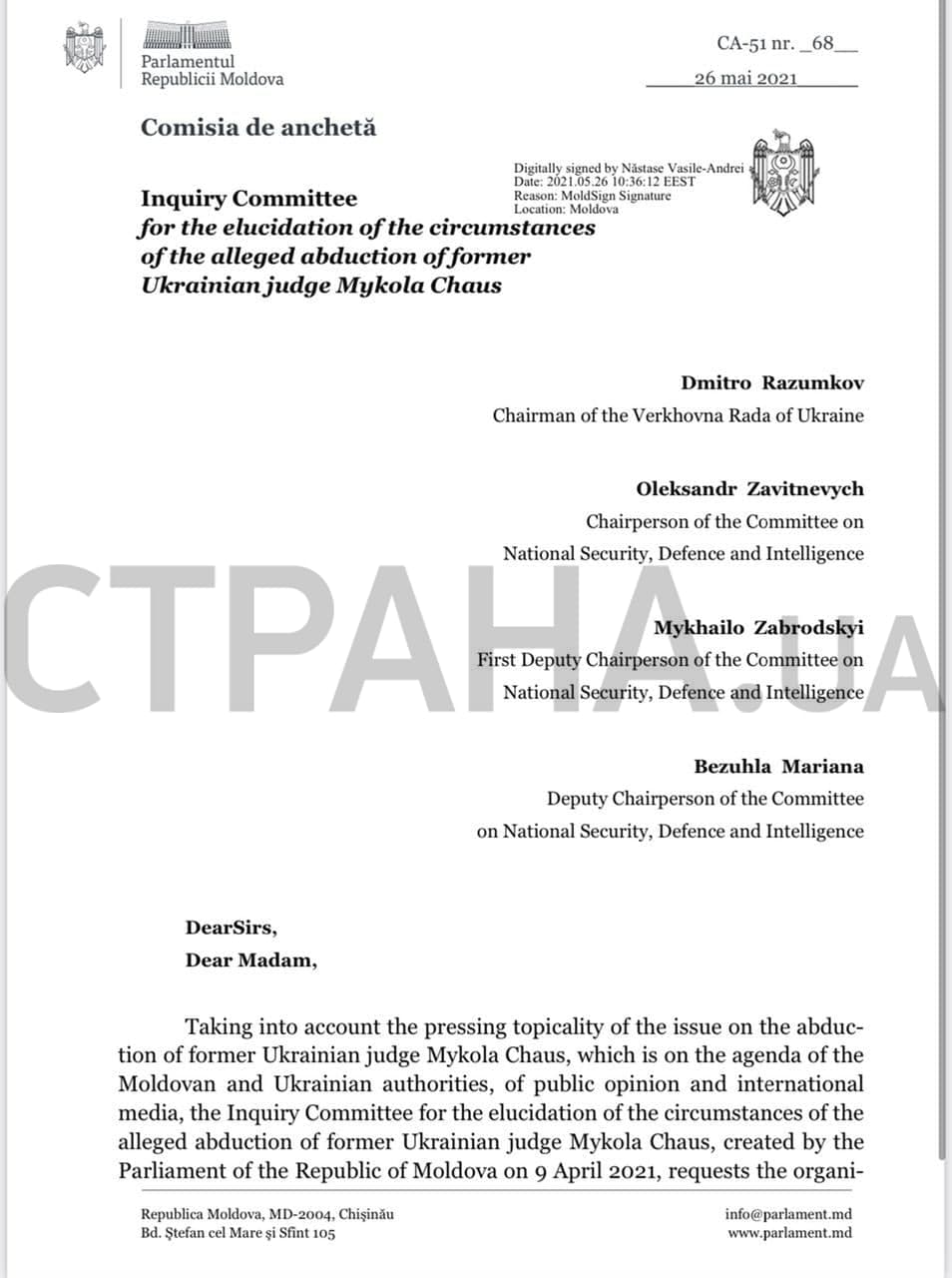 С целью налаживания взаимодействия в проведении расследования обстоятельств похищения экс-судьи Николая Чауса, следственный комитет, который был создан Парламентом Республики Молдова, обратился с инициативой в Верховную Раду Украины с предложением об организации с 28 по 31 мая 2021 встречи в двустороннем межпарламентском молдовско- украинском формате. Однако, несмотря на эту инициативу, пока со стороны властей Украины никакой реакции нет", - сообщил "Стране" Александр Вишневый.