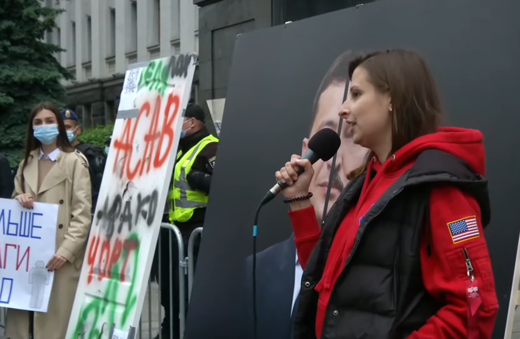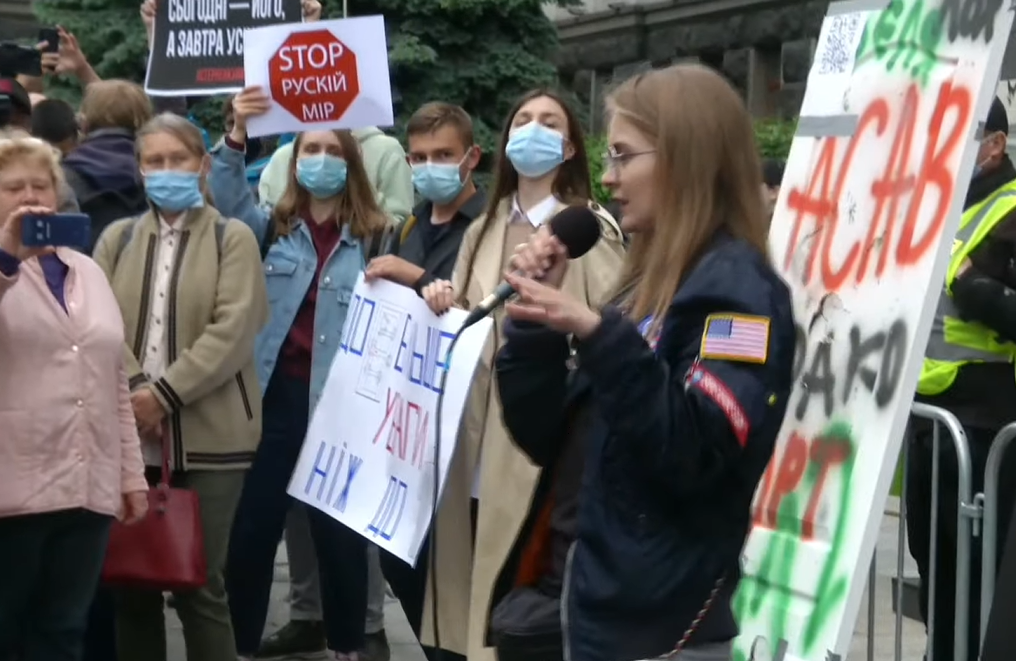 18:48  Еще одна активистка - Анна Гвоздяр - вышла к микрофону с американским флагом на рукаве. Она заявила, что уже восемь лет защищает Украину "от всякой русни".