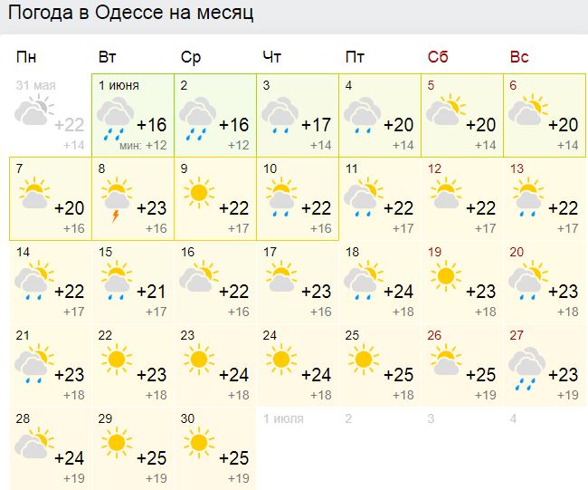 Начало июня в Одессе обещают довольно хмурым, с дождями и дневной температурой +16...+17. С 4 июня воздух прогреется до +20, наступят солнечные дни. С 8 июня днем будет +23...+25. Периодически будут идти дожди.