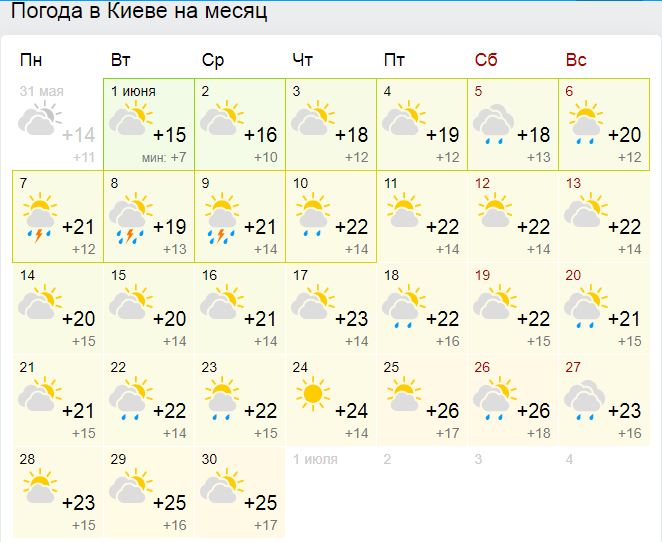 С 1 по 5 июня в Киеве днем +15...+18. С 6 по 10 июня дожди, грозы, воздух прогреется до +20...+22. С 11 по 17 июня период без дождей, днем +22...+23. Далее в отдельные дни обещают осадки.