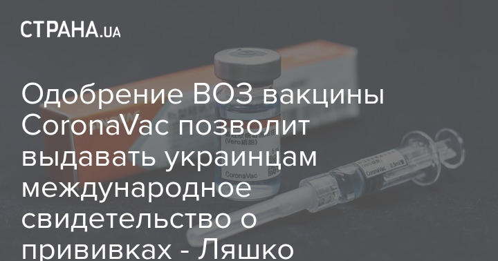 Министр здравоохранения Украины Виктор Ляшко заявил, что одобрение Всемирной организацией здравоохранения китайской вакцины от коронавируса CoronaVac производства Sinovac Biotech позволяет выдать украинцам международное свидетельство о проведении вакцинации. Свидетельство получат все, кто прошел полный курс прививок.