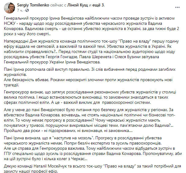 Ирина признала, что я "наступил на мозоль". Прогресса в расследовании убийства черкасского журналиста нет. Несмотря на множество экспертиз и усилий правоохранителей", - написал Томиленко и добавил, что он предложит, чтобы на встречу с Венедиктовой, где будут обсуждать хор расследования убийства Комарова, пригласили журналистов из Черкасс.