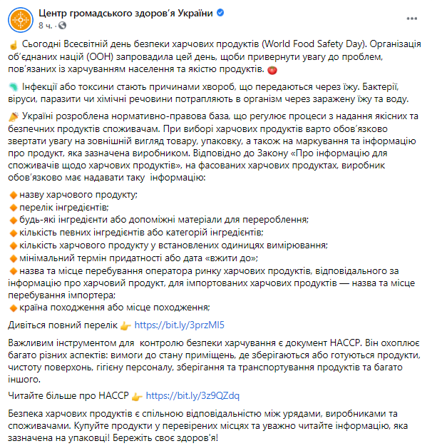 7 июня в мире отмечают День безопасности пищевых продуктов (World Food Safety Day), который Организация объединенных наций ввела, чтобы привлечь внимание к проблемам, связанным с питанием населения и качеством продуктов. Об этом сообщает Центр общественного здоровья при Минздраве Украины.