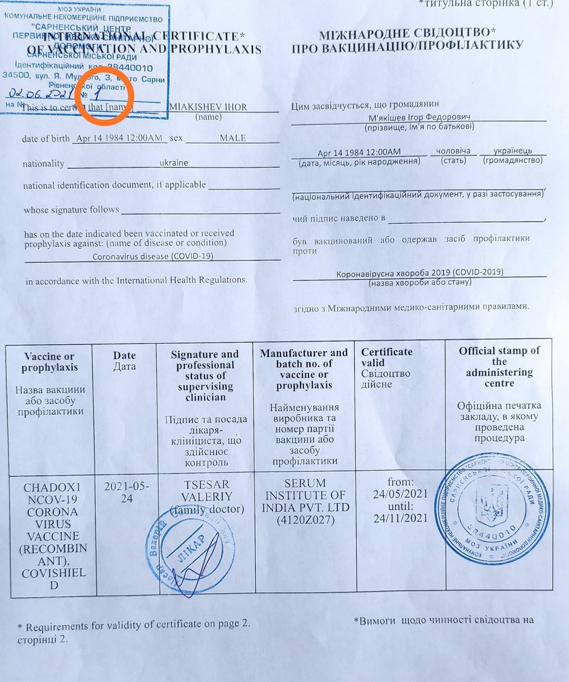 - сертификат вакцинации от коронавируса;