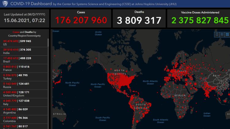 По данным на 15 июня, число зараженных на Земле перевалило уже за 176 миллионов, фото: университет Дж. Хопкинса