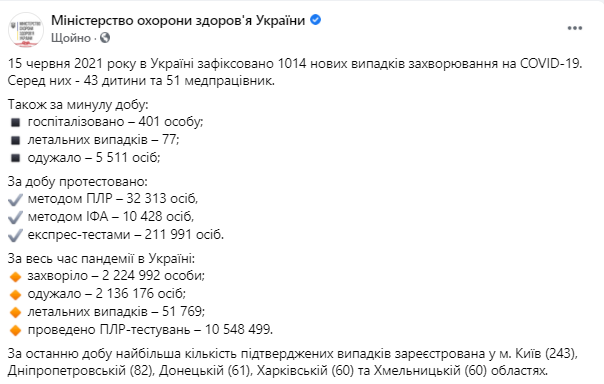 По состоянию на утро вторника, 15 июня, общее количество зараженных коронавирусом в Украине с начала эпидемии выросло еще на 1 014 человек.