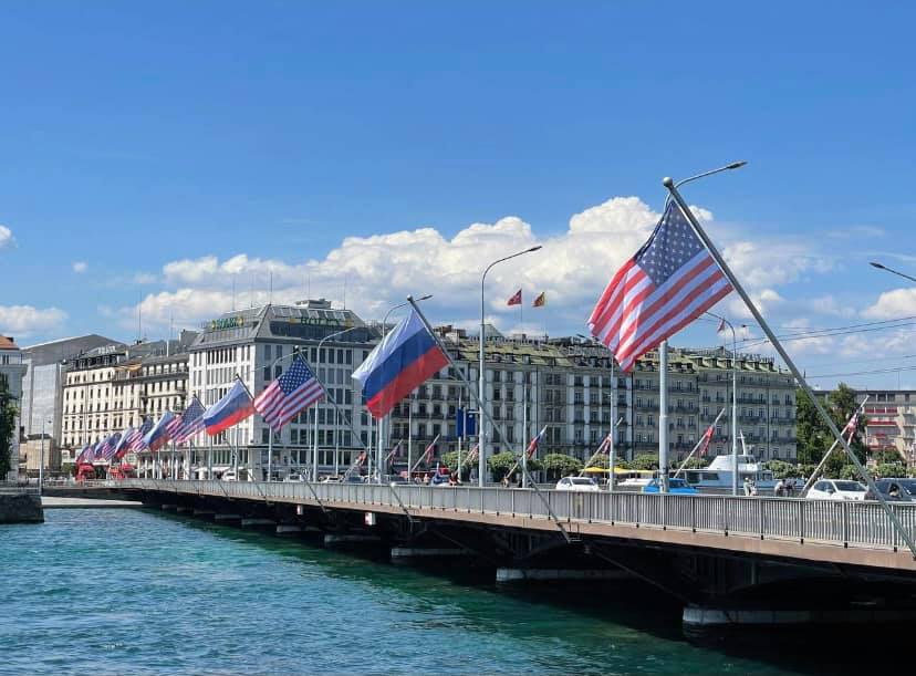 10:31 Мост в центре Женевы украсили американскими и российскими флагами.