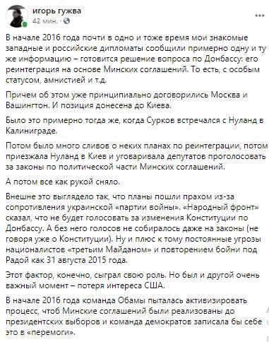 "В начале 2016 года почти в одно и то же время мои знакомые западные и российские дипломаты сообщили одну и ту же информацию – готовится решение вопроса по Донбассу: его реинтеграция на основе Минских соглашений. То есть с особым статусом, амнистией и т.д.