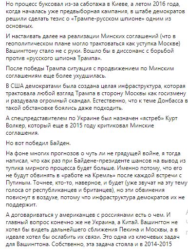 На фоне многих прогнозов о чуть ли не грядущей войне, я тогда написал, что как раз при Байдене-президенте шансов на вывод из тупика мирного процесса будет больше. Именно потому, что его не будут обвинять в "работе на Кремль" после каждой встречи с Путиным. Точнее, кто-то, наверное, и будет (уже звучат на эту тему голоса от республиканцев и британцев), но эти обвинения повиснут в воздухе, потому что инфраструктура демократов их не поддержит.
