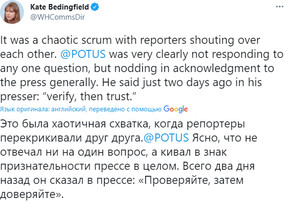 "Там была беспорядочная толкучка, и репортеры перекрикивали друг друга. Президент США очевидным образом не отвечал ни на один из этих вопросов, он кивал в знак признательности прессе в целом. Он всего лишь два дня назад говорил на своей пресс-конференции: "Сначала проверяй, а потом уже доверяй"", - написала в Твиттере директор по коммуникациям Белого дома Кейт Бедингфилд.
