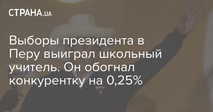 После подсчета всех голосов на президентских выборах в Перу лидирует кандидат от социалистов, школьный учитель Педро Кастильо, немного опережая свою консервативную соперницу Кейко Фухимори. По результатам голосования, Фухимори получила 49,875% голосов, а Кастильо - 50,125%. Разница - всего лишь 0,25%. Об этом сообщает Reuters.
