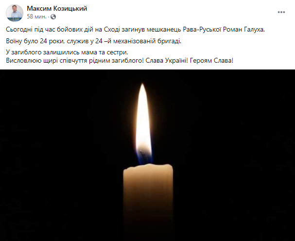 О гибели Романа Галухи в соцсети написал также и глава Львовской областной государственной администрации (ОГА) Максим Козицкий.