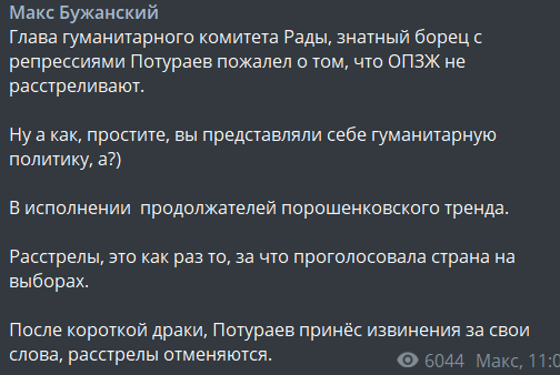 "Глава гуманитарного комитета Рады, знатный борец с репрессиями Потураев пожалел о том, что ОПЗЖ не расстреливают.