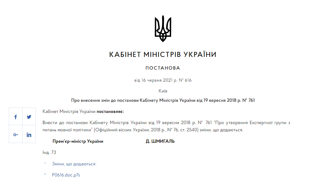 Таким образом Кабмин внес изменения в состав экспертной группы по вопросам языковой политики.  При этом состав экспертной группы утвержден только с указанием должностей тех, кто в нее вошел, но без фамилий.