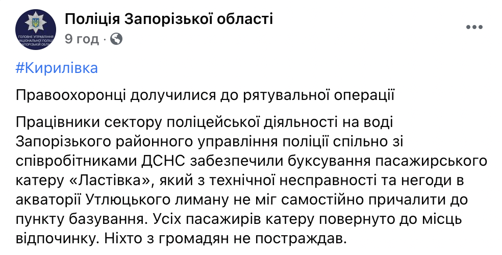 В курортном поселке Кирилловка Запорожской области на протяжении нескольких часов спасатели проводили операцию по спасению пассажиров прогулочного катера, который поломался во время круиза.
