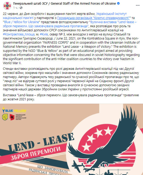 А вот украинский Генштаб решил не скорбеть по жертвам немецкого нападения, а отрекламировал выставку, направленную против СССР - страны, на которую как раз в этот день напали.