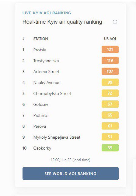 Состояние воздуха в Киеве 22 июня по данным IQAir