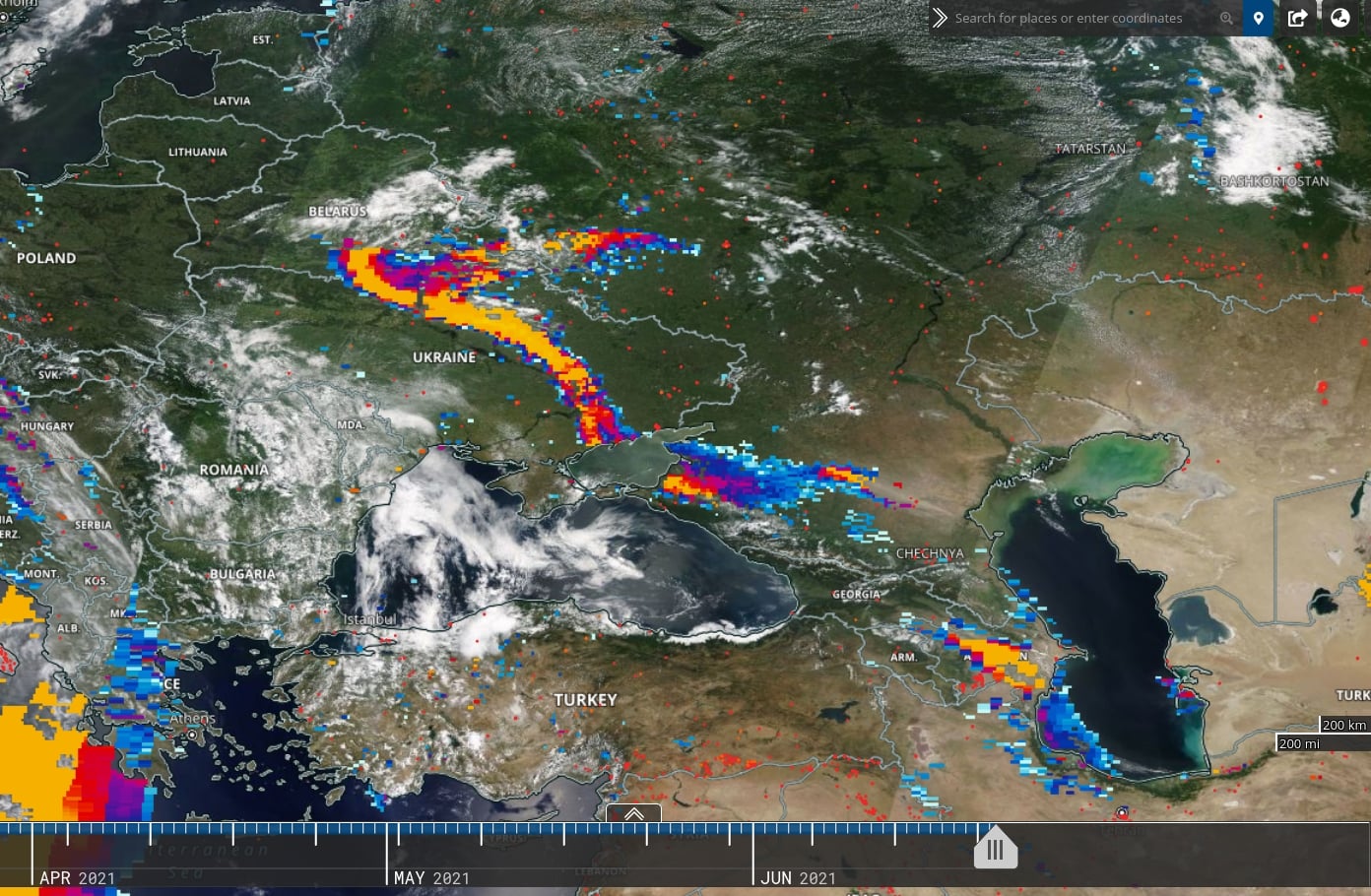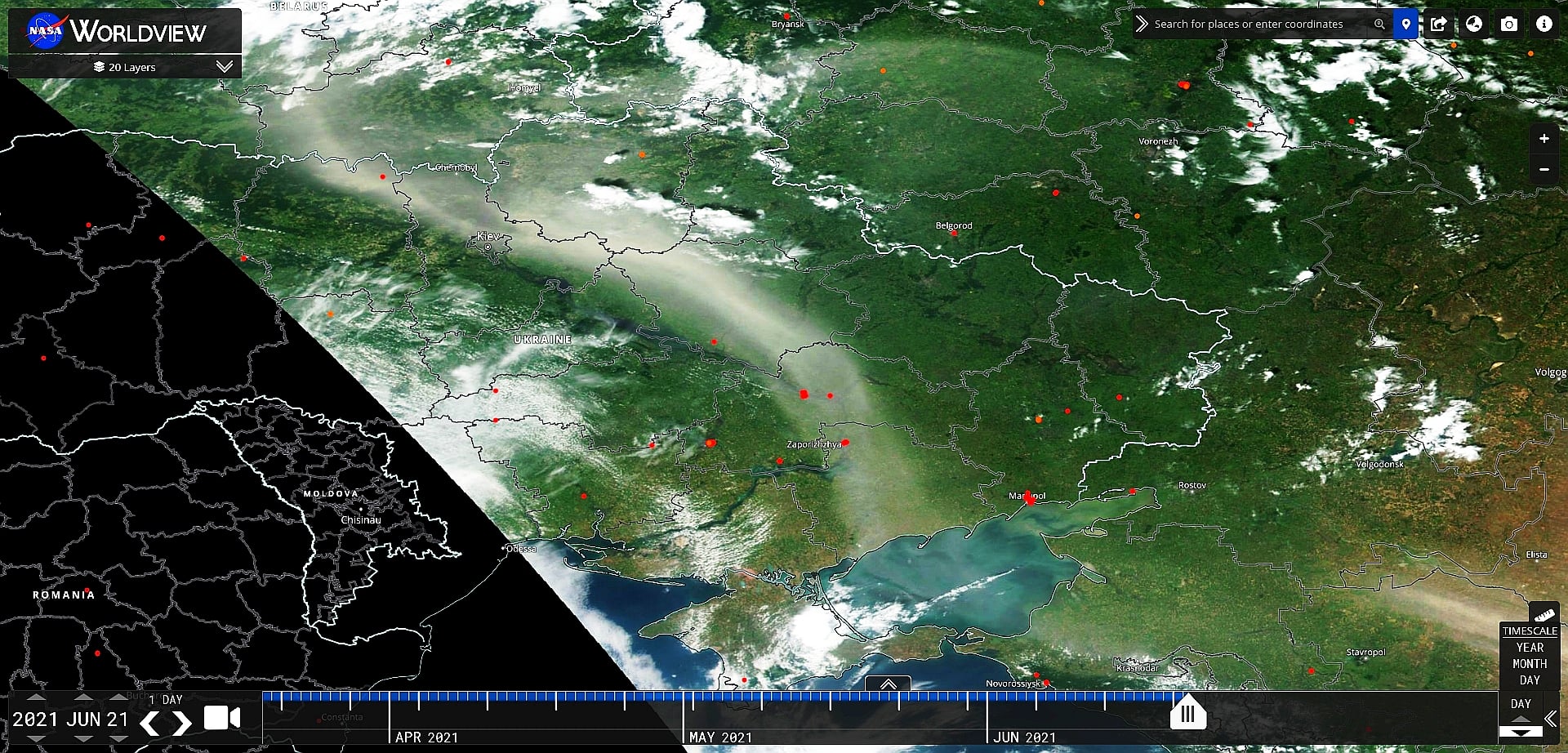 На них можно увидеть, что 21 июня пылевое облако накрыло левобережную часть Украины.