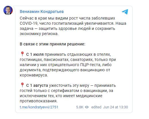 "В связи с этим приняли решение с 1 июля принимать отдыхающих в отелях, гостиницах, пансионатах, санаториях и детских лагерях, только при наличии у них отрицательного ПЦР-теста либо документа, подтверждающего вакцинацию от коронавируса", - написал он.