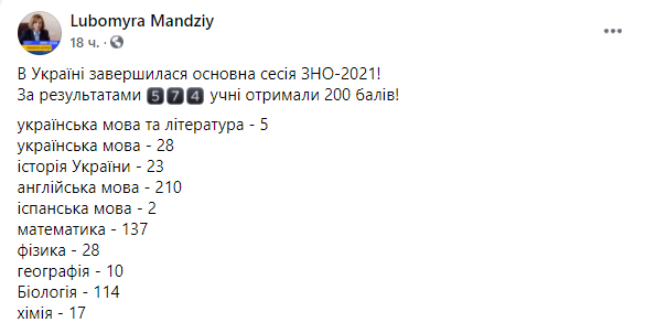 Также она конкретизировала количество отличников по каждому из сданных предметов. Согласно опубликованным данным, менее всего высших баллов получено по украинскому языку и литературе. Этот тест проходили около 222,5 тысяч участников, а на 200 баллов ответили лишь пятеро.