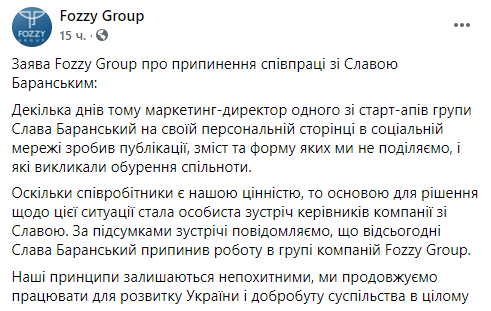29 июня Fozzy Group официально заявила про "прекращение сотрудничества" с Вячеславом Баранским. Причиной назвали пресловутые публикации в соцсетях, "содержание и форму которых в компании не разделяют, и которые вызвали возмущение общества".