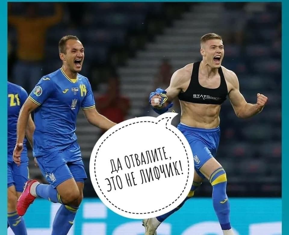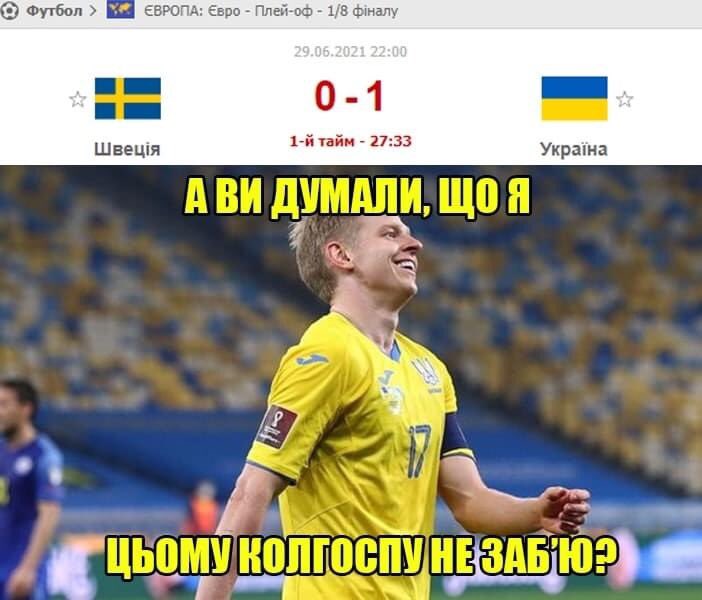 Когда Украина открыла счет - 1:0 и забил Александр Зинченко, в сети появился мем с довольным лицом футболиста и подписью: "А вы думали, что я этому колхозу не забью?"