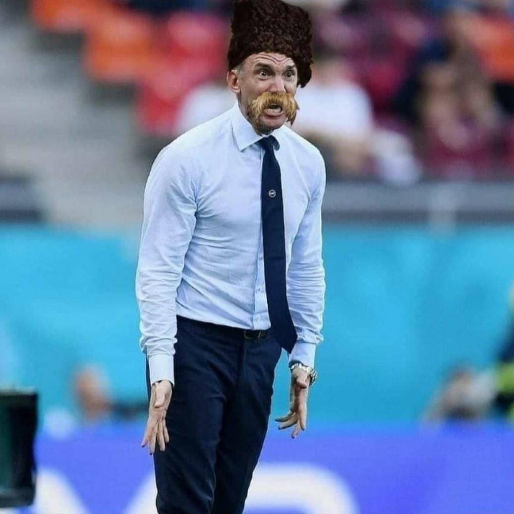 Поскольку Шевченко - фамилия, известная в мире благодаря украинскому писателю и поэту Тарасу Шевченко, однофамильца Кобзаря, тренера - Андрея Шевченка стилизовали под его тезку. Дорисовали в фоторедакторе овечью шапку и усы. Сделали похожим на Тараса Шевченко, изображенного на известном портрете в школьном учебнике.