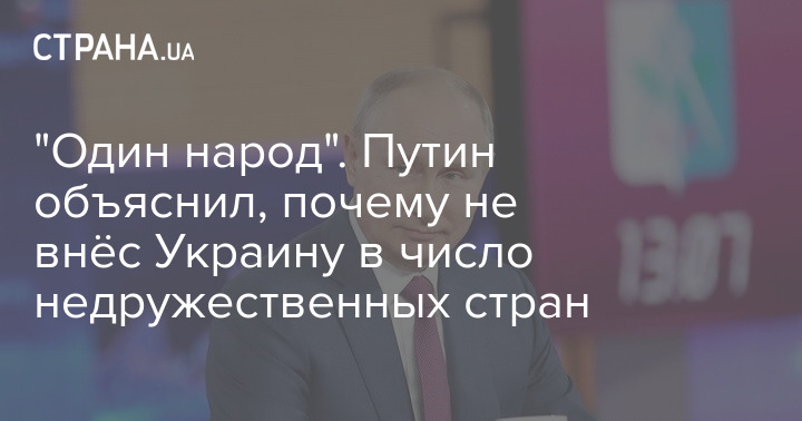 Президент России Владимир Путин заявил, что украинцы и россияне - это один народ, поэтому признавать Украину недружественной для РФ нельзя.