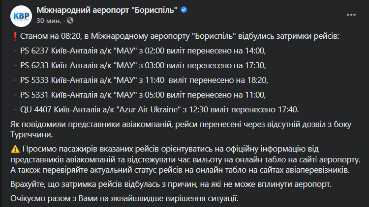 В Борисполе задерживают пять рейсов в Турцию. Объясняют отсутствием разрешений с турецкой стороны