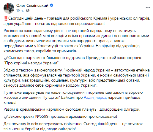 "Сегодняшний день - трагедия для российского Кремля и украинских олигархов, а для украинского - начало восстановления справедливости! Россияне на законодательном уровне - не коренной народ, поэтому не смогут в полной мере владеть всеми правами человека и основными свободами, определенными нормами международного права, а также предусмотренными в Конституции и законах Украины. В отличие от украинских, крымских татар, караимов и крымчаков", - считает Семинский.