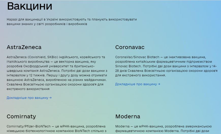Пока на официальном сайте, посвященном вакцинации от коронавируса в Украине, среди препаратов, которые используют или планируют использовать, четыре наименования: AstraZeneca, Coronavac, Comirnaty и Moderna.