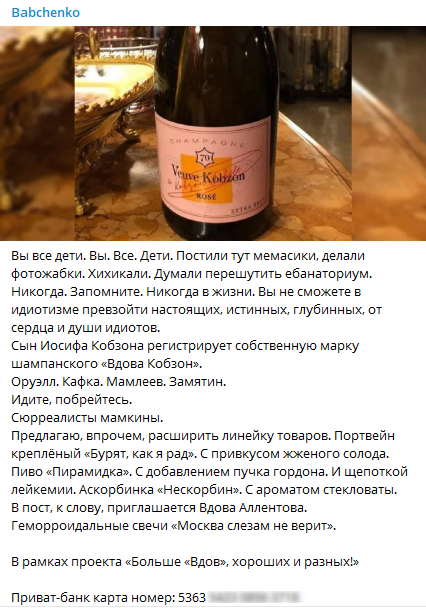 Вот и на смерти Владимира Меньшова он также не преминул пропиариться и оставить номер своей банковской карты. "В пост, к слову, приглашается вдова Алентова. Геморроидальные свечи "Москва слезам не верит". В рамках проекта "Больше "Вдов" хороших и разных!", - написал посмертный текст наподобие тоста Бабченко.
