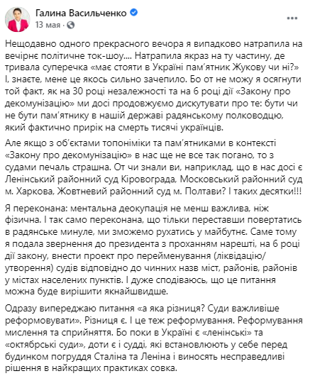 ... Только перестав возвращаться в советское прошлое, мы сможем двигаться в будущее. Именно поэтому я подала обращение к президенту с просьбой наконец, на 6 году действия закона, внести проект о переименовании (ликвидации/ образования) судов в соответствии с действующими названиями городов, районов, районов в городах населенных пунктов..." - написала она.