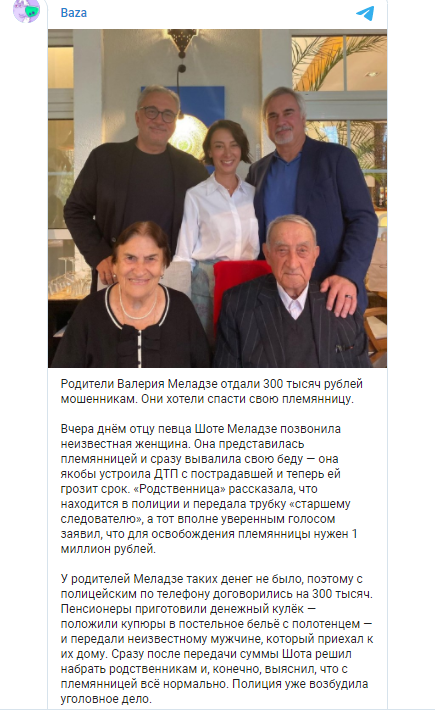 В четверг, 8 июля, отцу исполнителя Шоте Меладзе позвонила неизвестная женщина, которая представилась племянницей и пожаловалась, что якобы устроила ДТП с пострадавшей и теперь ей грозит тюремное заключение. Неизвестная добавила, что находится в отделении полиции и передала трубку человеку, который назвал себя старшим следователем. Мужчина заявил, что для освобождения так называемой родственницы требуется один миллион рублей.