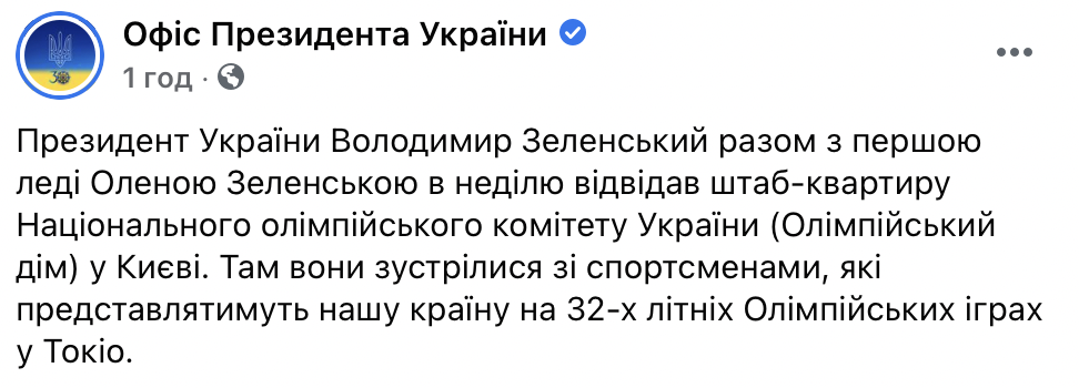 "В центре для экипировки членов национальной олимпийской сборной Украины Владимиру Зеленскому продемонстрировали образцы формы украинских олимпийцев для участия в Олимпиаде-2020, которая из-за пандемии COVID-19 пройдет в этом году в столице Японии с 23 июля по 8 августа. Президент и первая леди отметили стильный дизайн экипировки национальной сборной, спортсмены-олимпийцы добавили, что она еще и очень удобная", - сообщили в Офисе президента.
