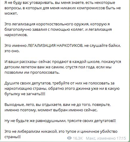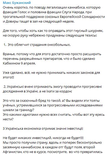 "Очень коротко, по поводу легализации каннабиса, которую фракция "Голос" и половина фракции "Слуга Народа", при трогательной поддержке союзных "Европейской Солидарности" и "Довиры" тащат в зал на следующей неделе.